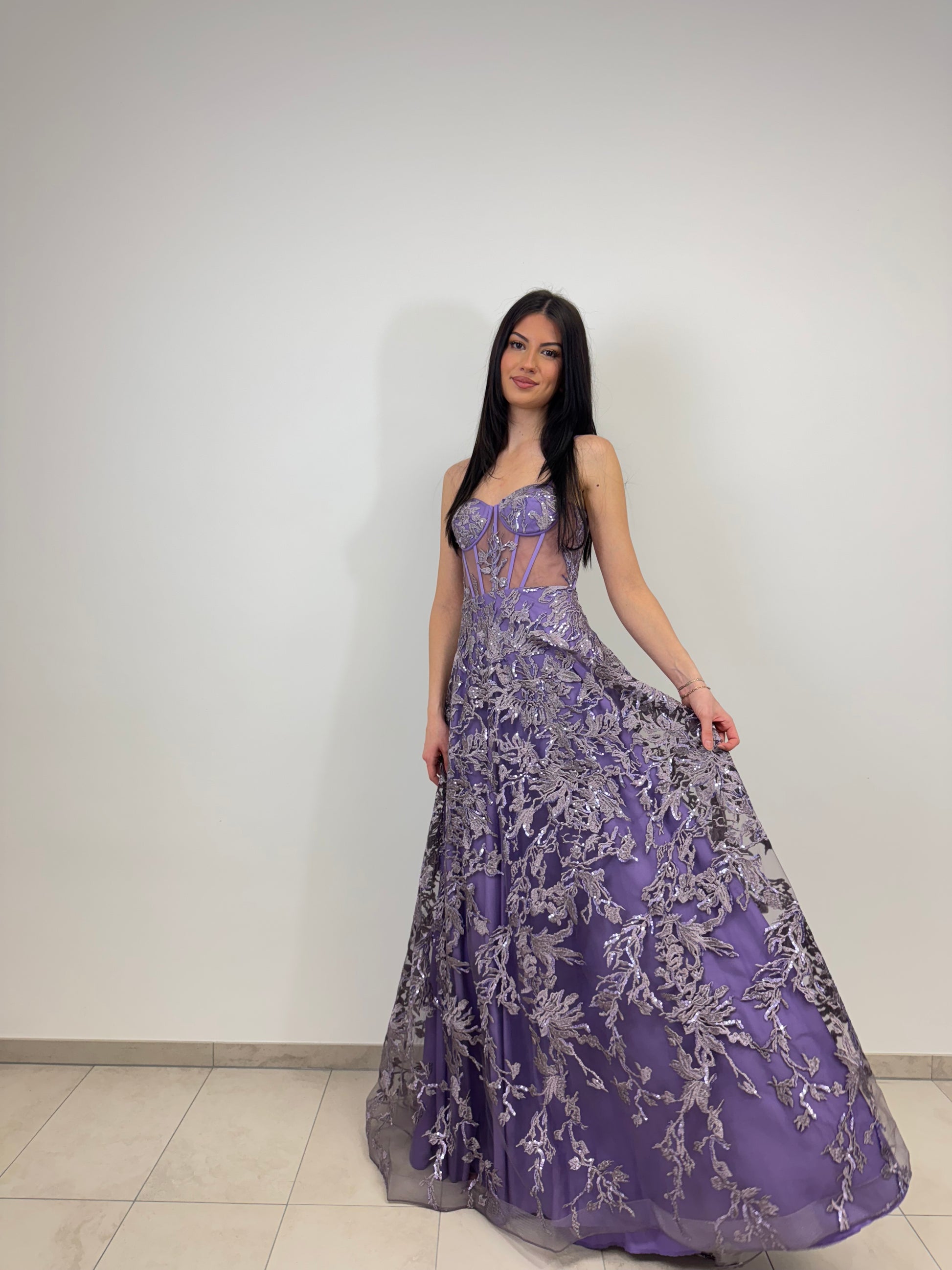 Wunderschönes Corsagenkleid in A-Linie, bodenlang. Fein bestickt mit leichter Transparenz an der Corsage und ausgestattet mit dünnen Trägern, ein elegantes Kleid für besondere Anlässe. Reißverschluss an der hinteren Mitte.