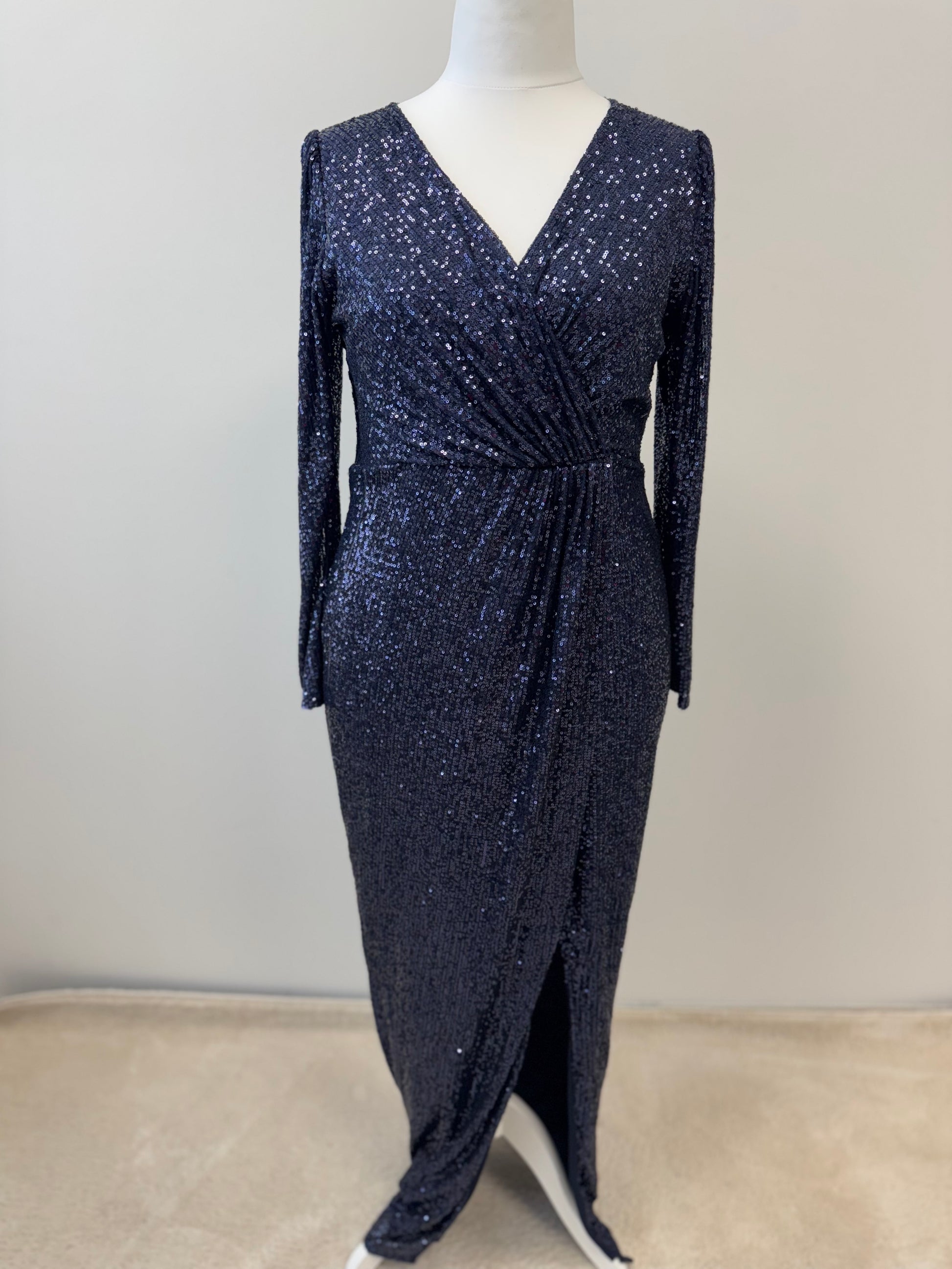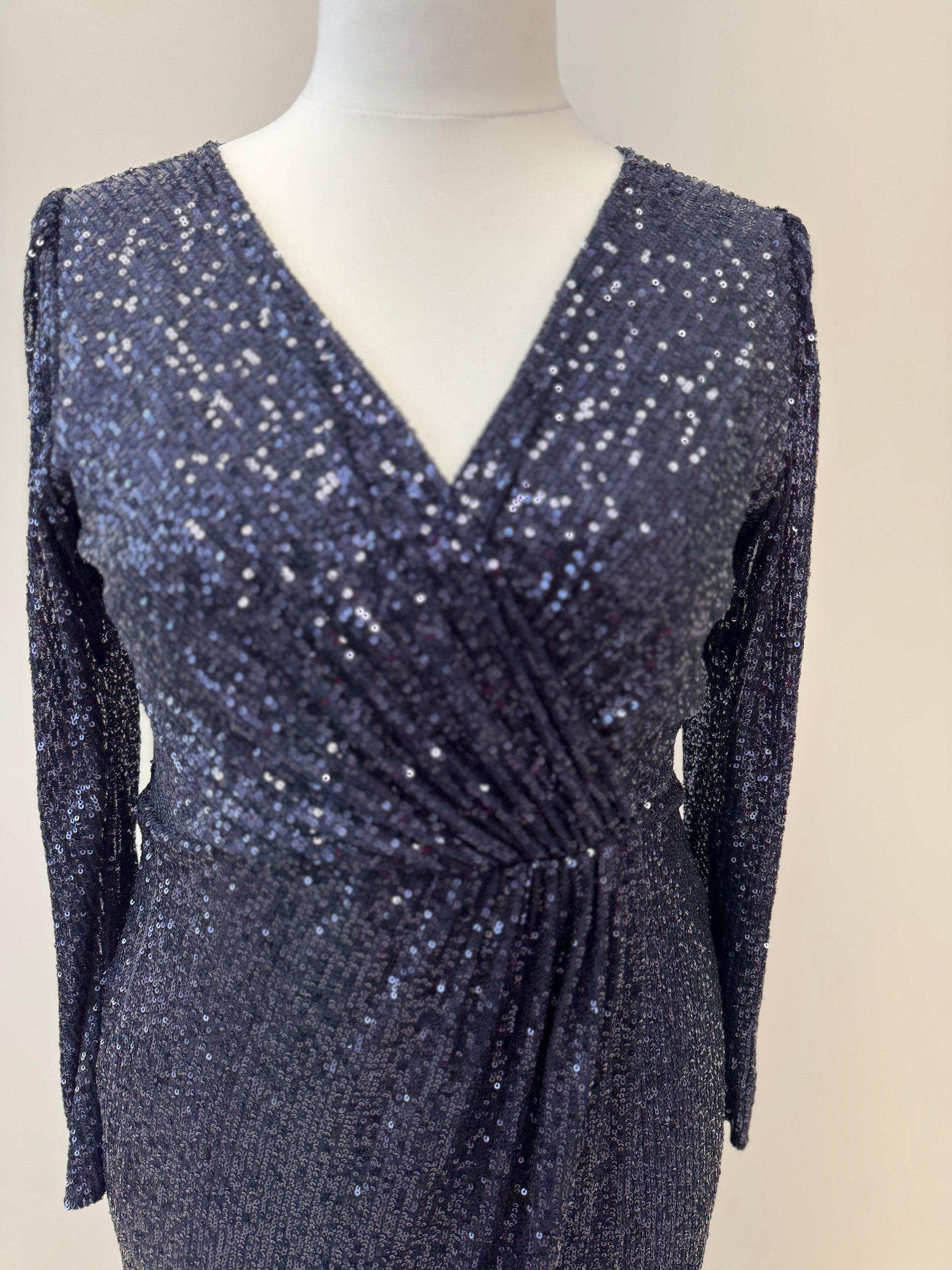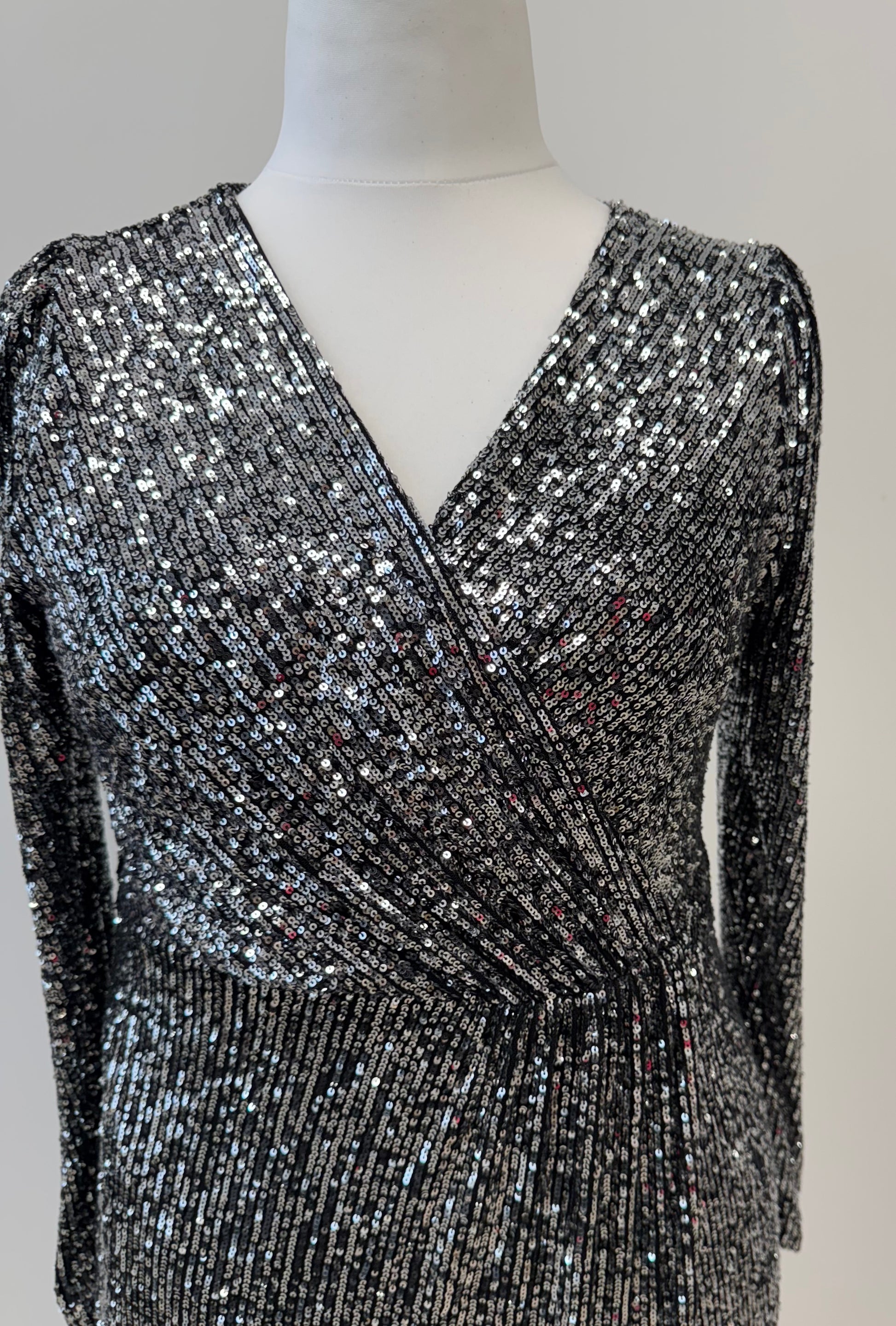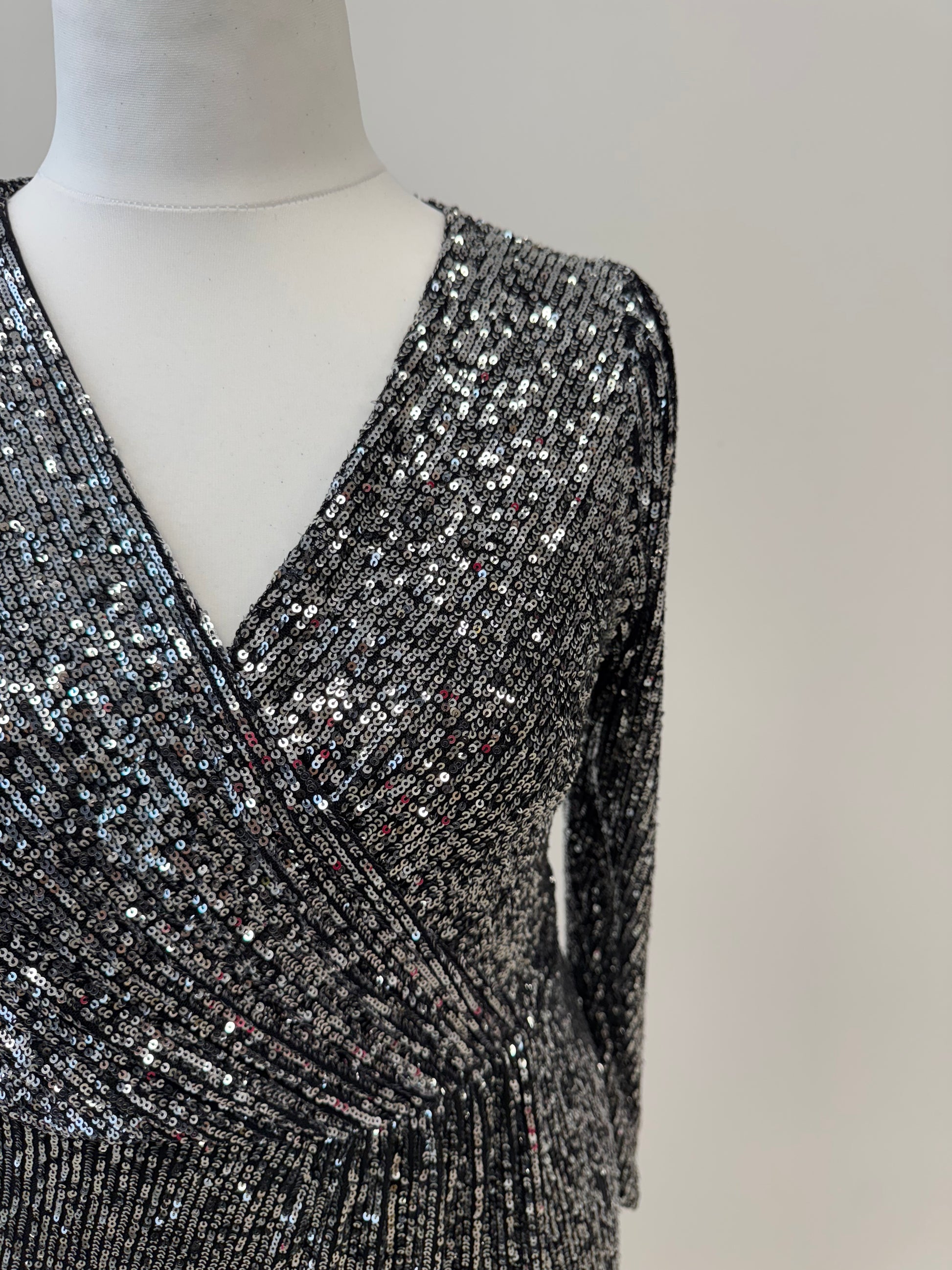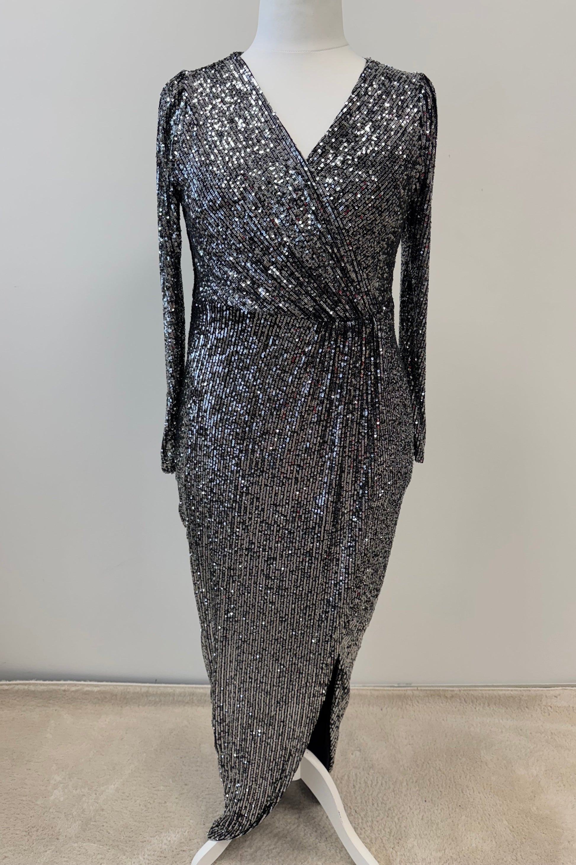 Dieses elegante Abendkleid ist vollständig mit fein aufgenähten Pailletten besetzt und sorgt dadurch für einen edlen, gleichmäßigen Schimmer. Der V-Ausschnitt in Wickeloptik formt ein schönes Dekolleté, während die dezente Raffung an der Taille eine feminine Silhouette zaubert. Die lange, gerade geschnittene Rockpartie mit leichtem Beinschlitz verleiht dem Kleid einen stilvollen, modernen Look. Die langen Ärmel runden das Design perfekt ab.