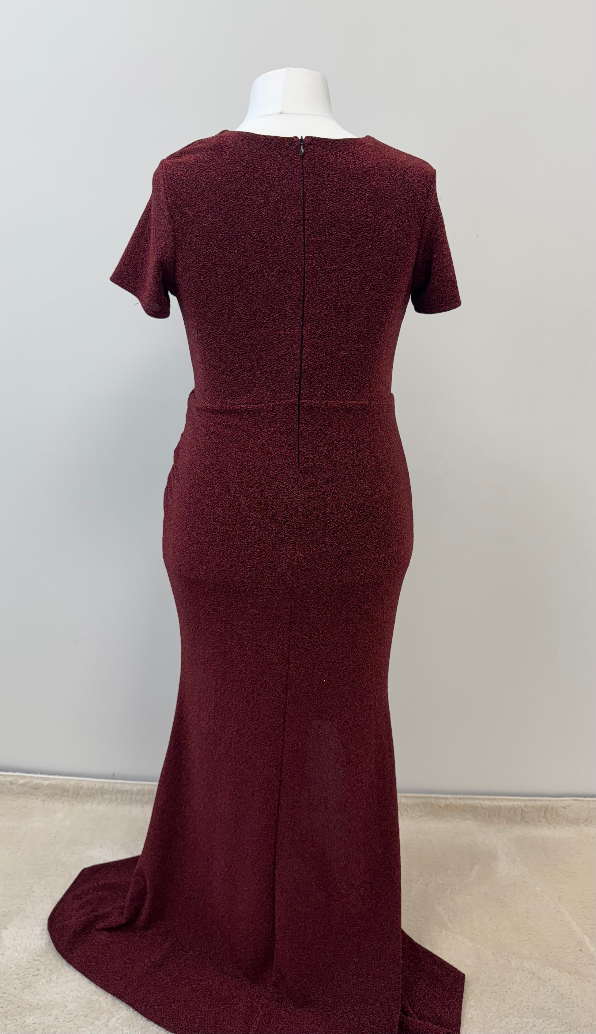 Dieses bodenlange Kleid besticht durch seinen femininen Schnitt und den leicht schimmernden Stoff in tiefem Bordeaux-Ton. Die raffinierte Wickeloptik mit seitlicher Raffung schmeichelt der Figur, während das funkelnde Strass-Element an der Taille einen edlen Akzent setzt. Der V-Ausschnitt und die kurzen Ärmel sorgen für eine elegante Silhouette. Der verdeckte Reißverschluss in der hinteren Mitte und der dezente Beinschlitz runden das Design harmonisch ab – ideal für festliche Anlässe, Galas oder Hochzeitsfeiern.
