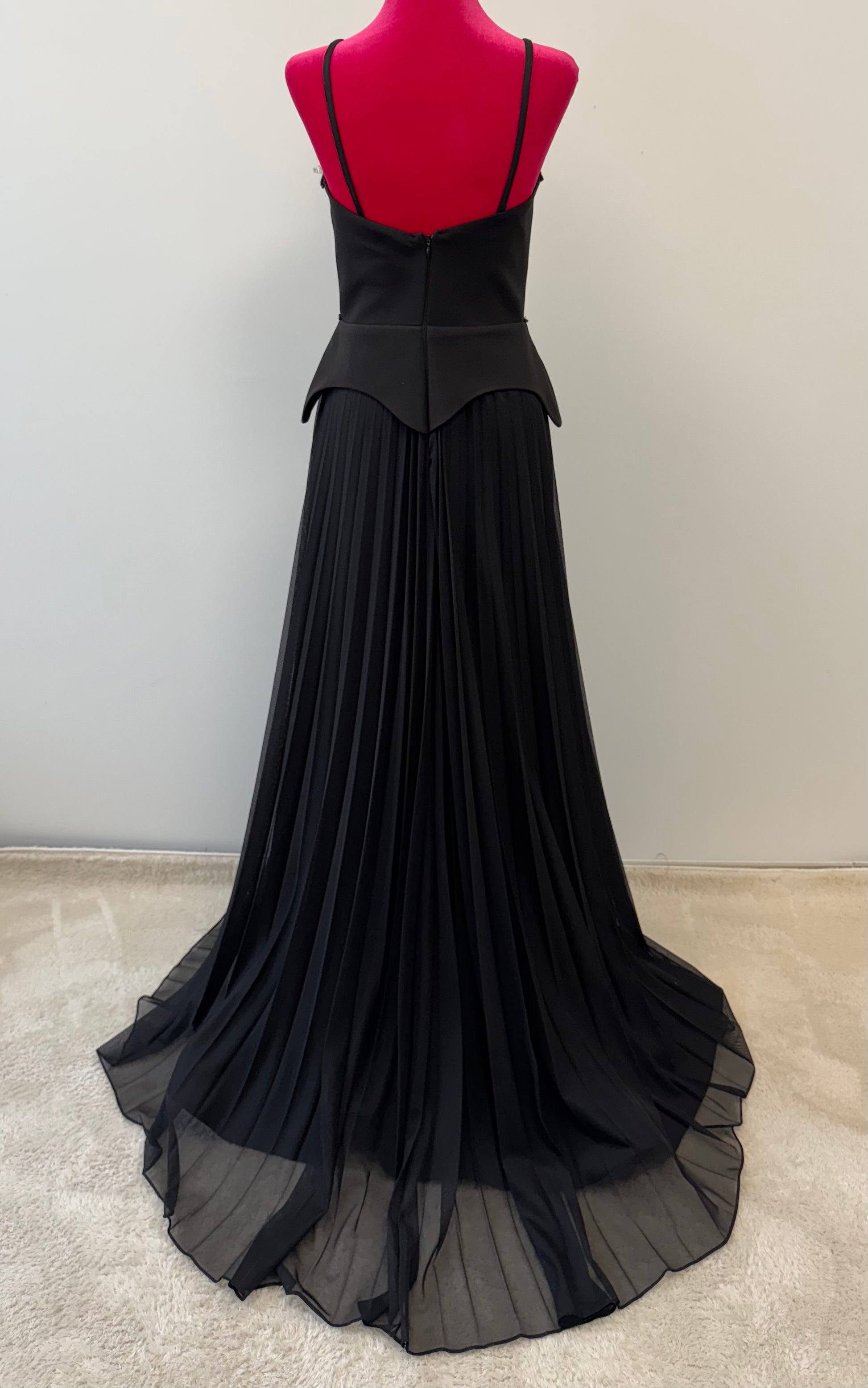 Das Oberteil geht in eine geschwungene Hüftpartie über, die wie ein elegantes Peplum wirkt und die Taille optisch verschmälert. Der lange, weich fallende Plissee-Rock aus Chiffon verleiht dem Kleid eine besonders feminine und leichte Bewegung.