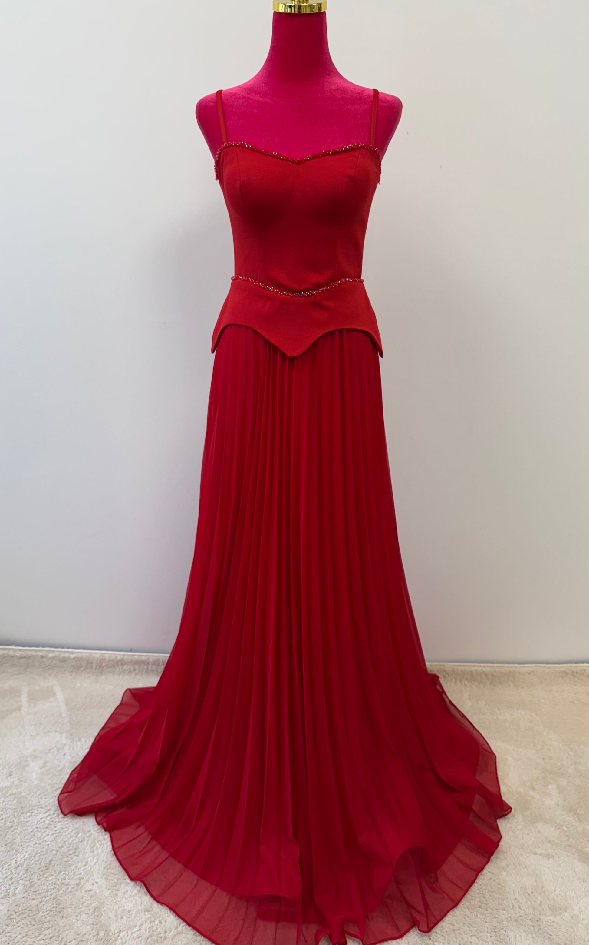 Dieses atemberaubende Abendkleid kombiniert ein figurbetontes Korsagen-Oberteil mit einer fließenden, bodenlangen Plissee-Rockpartie. Die Brustpartie ist gepolstert und sorgt für eine schön geformte Silhouette sowie optimalen Halt. Feine Perlenverzierungen entlang des Ausschnitts und der Taillenlinie setzen edle Akzente.