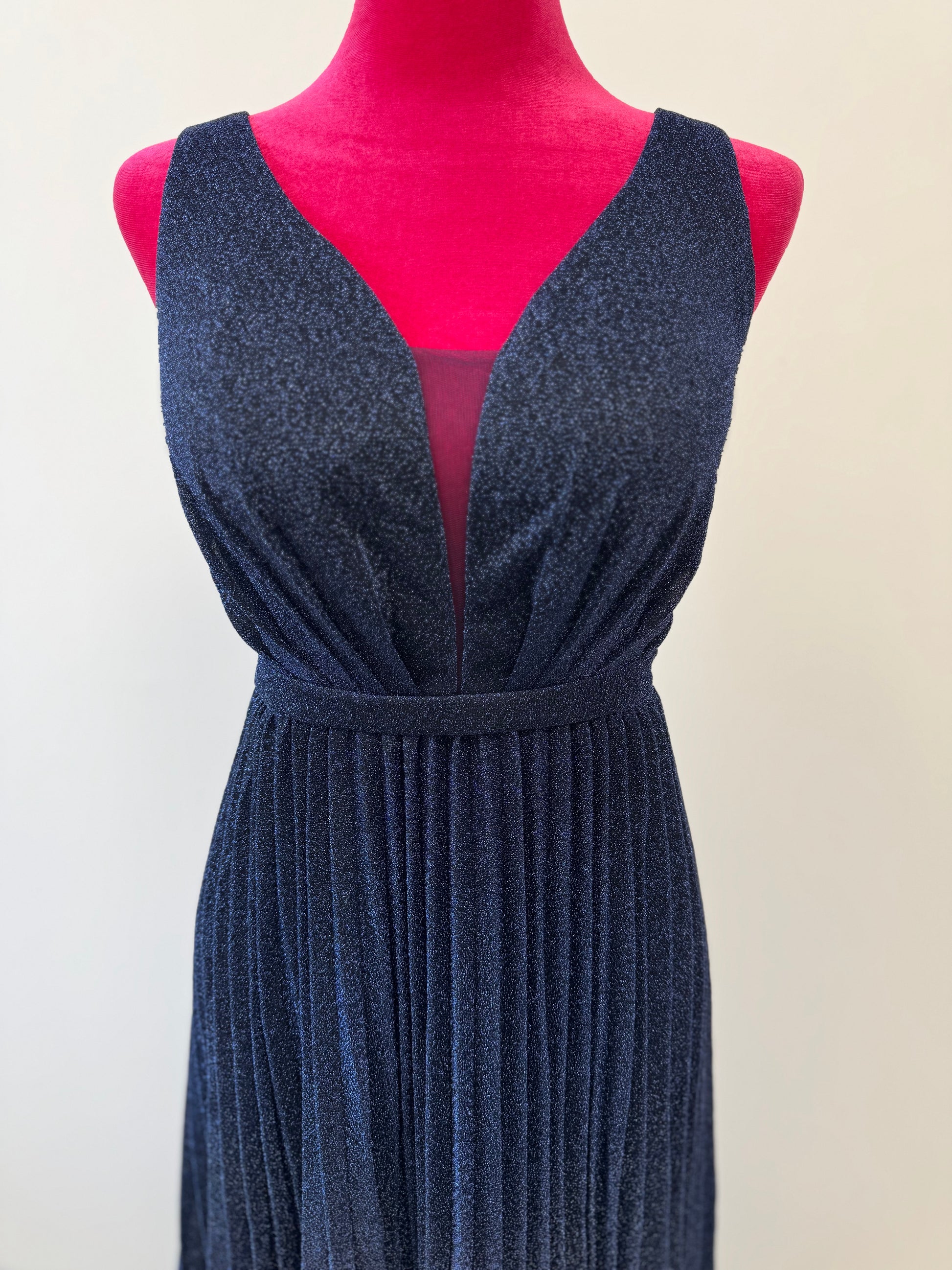 Die Taille ist leicht betont, während der bodenlange Plissee-Rock sanft fließend fällt und dem Kleid einen eleganten, schimmernden Look verleiht.
