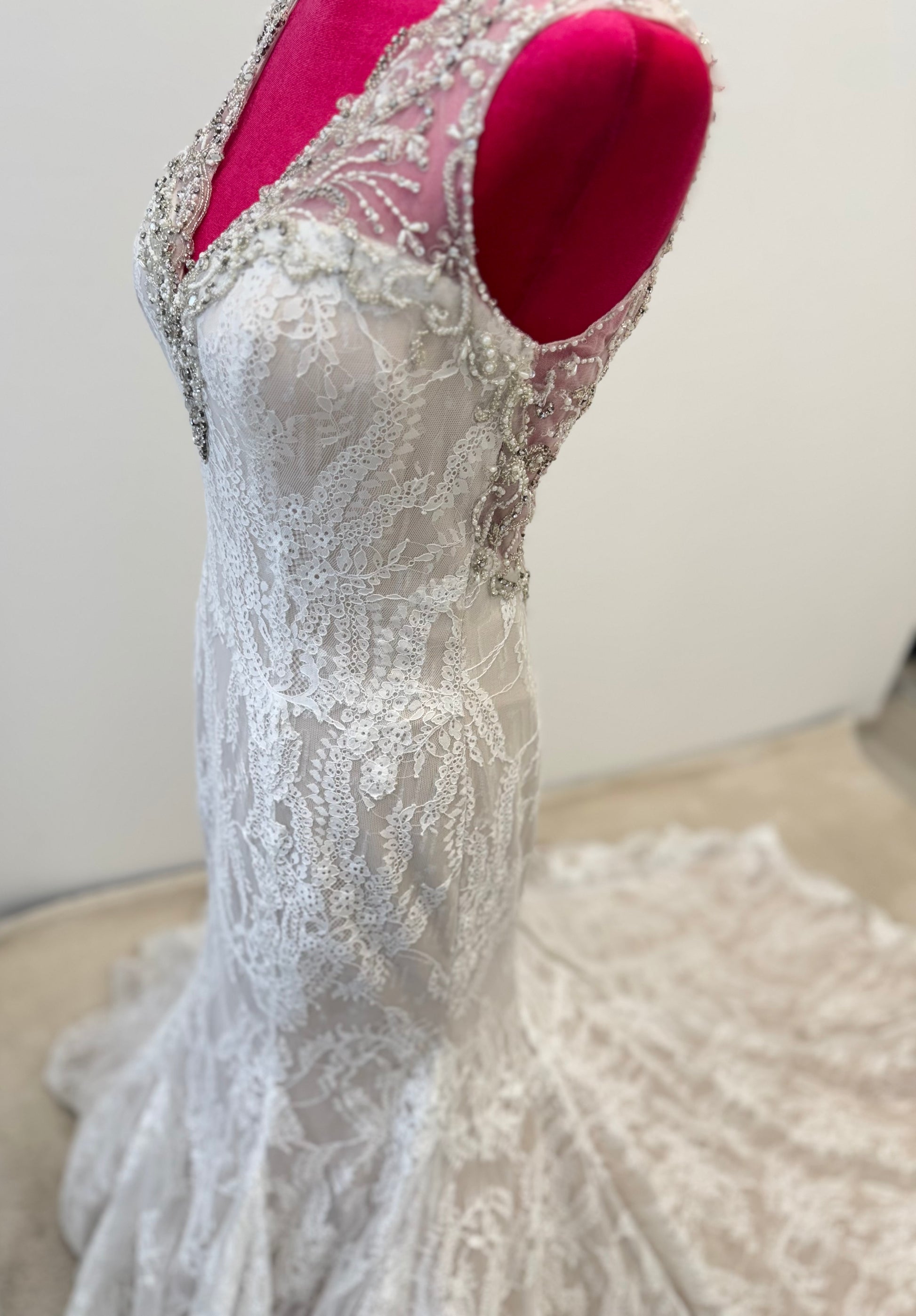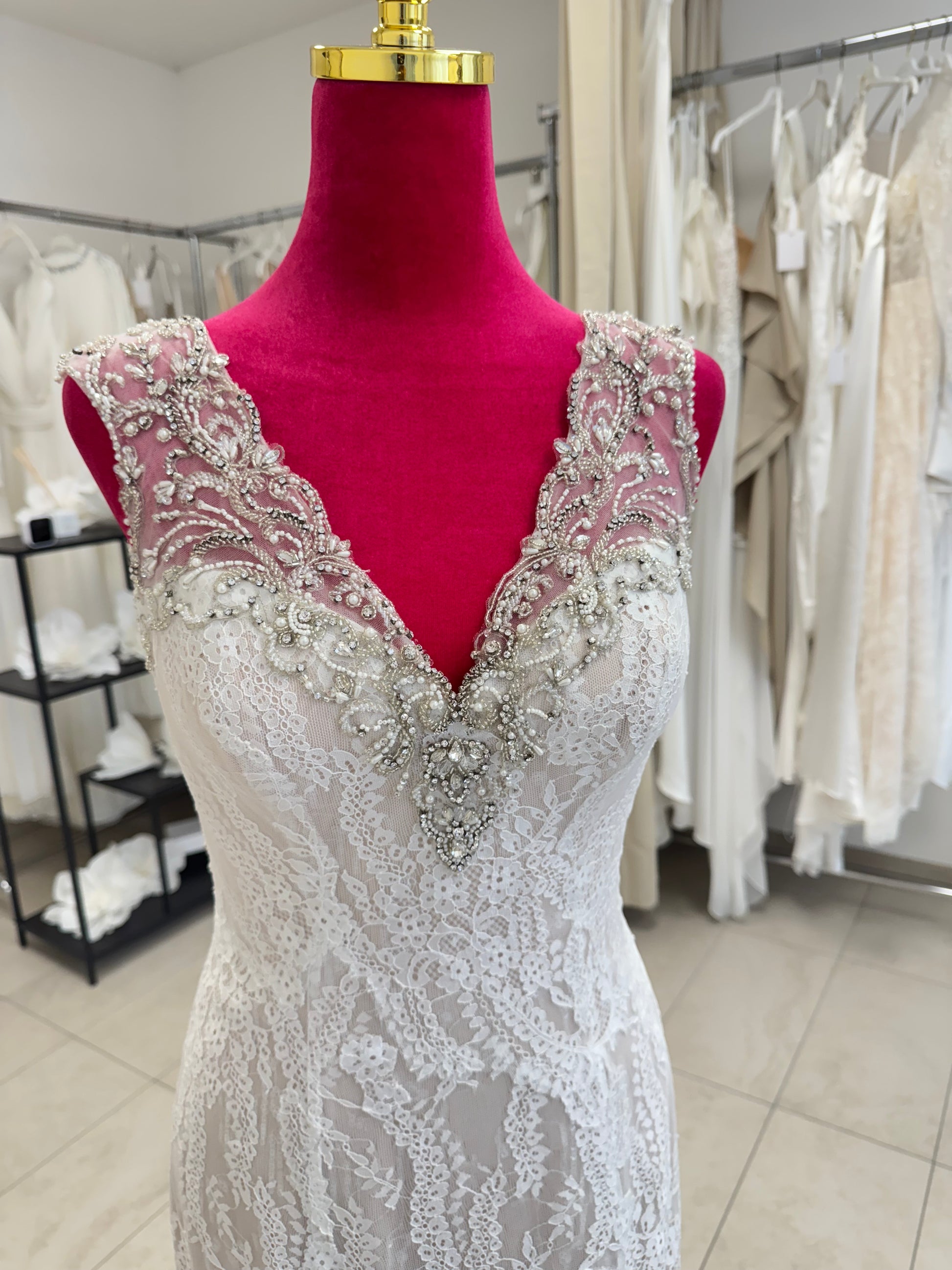 Ein besonderes Outlet-Modell für Bräute, die Wert auf Qualität, Designerarbeit und eine feminine, figurbetonende Silhouette legen.