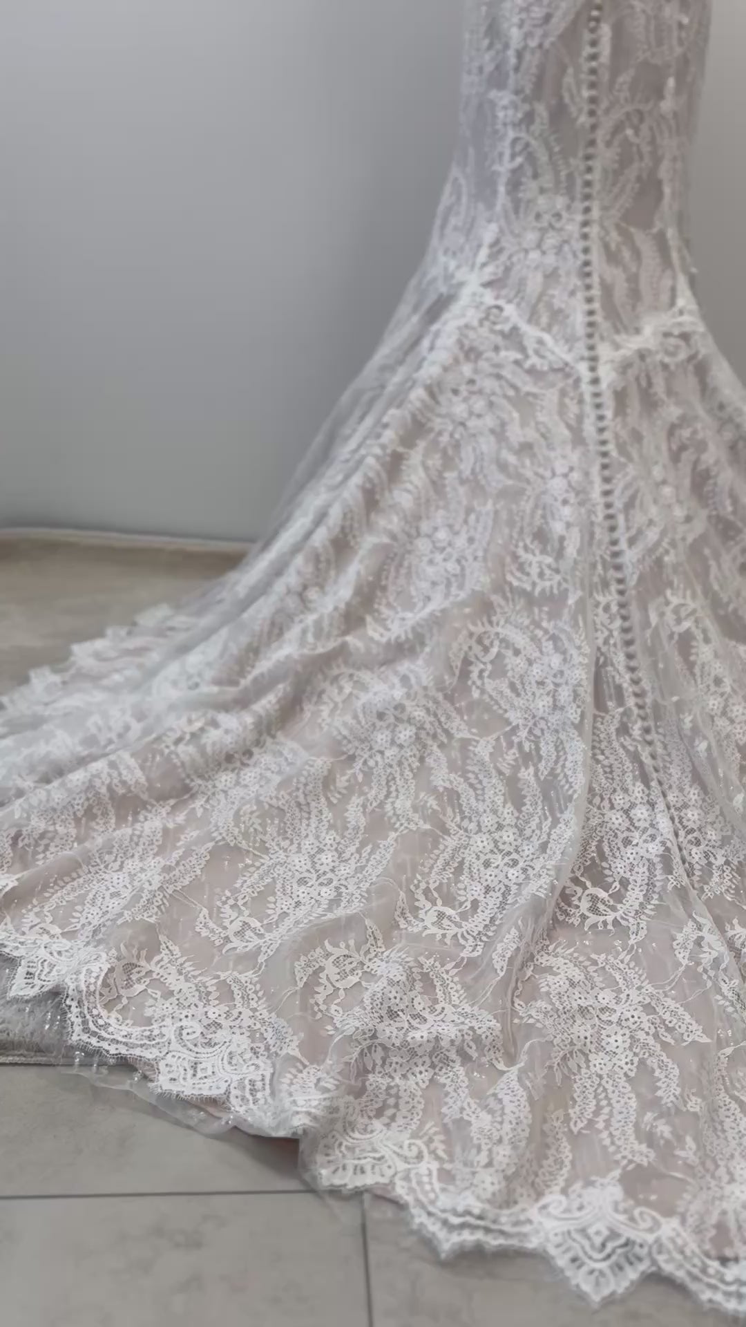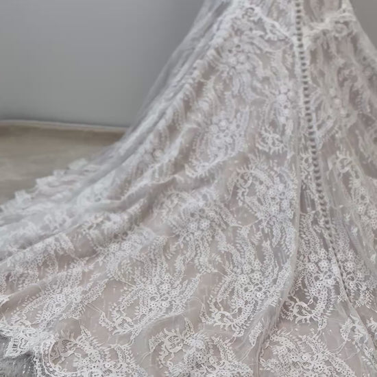 Die dreilagige Spitzenverarbeitung verleiht dem Kleid einen luxuriösen Vintage-Look: zarte Stickereien, fein gesetzte Perlen und eine kunstvolle transparente Rückenpartie sorgen für eine romantische und exklusive Ausstrahlung.
