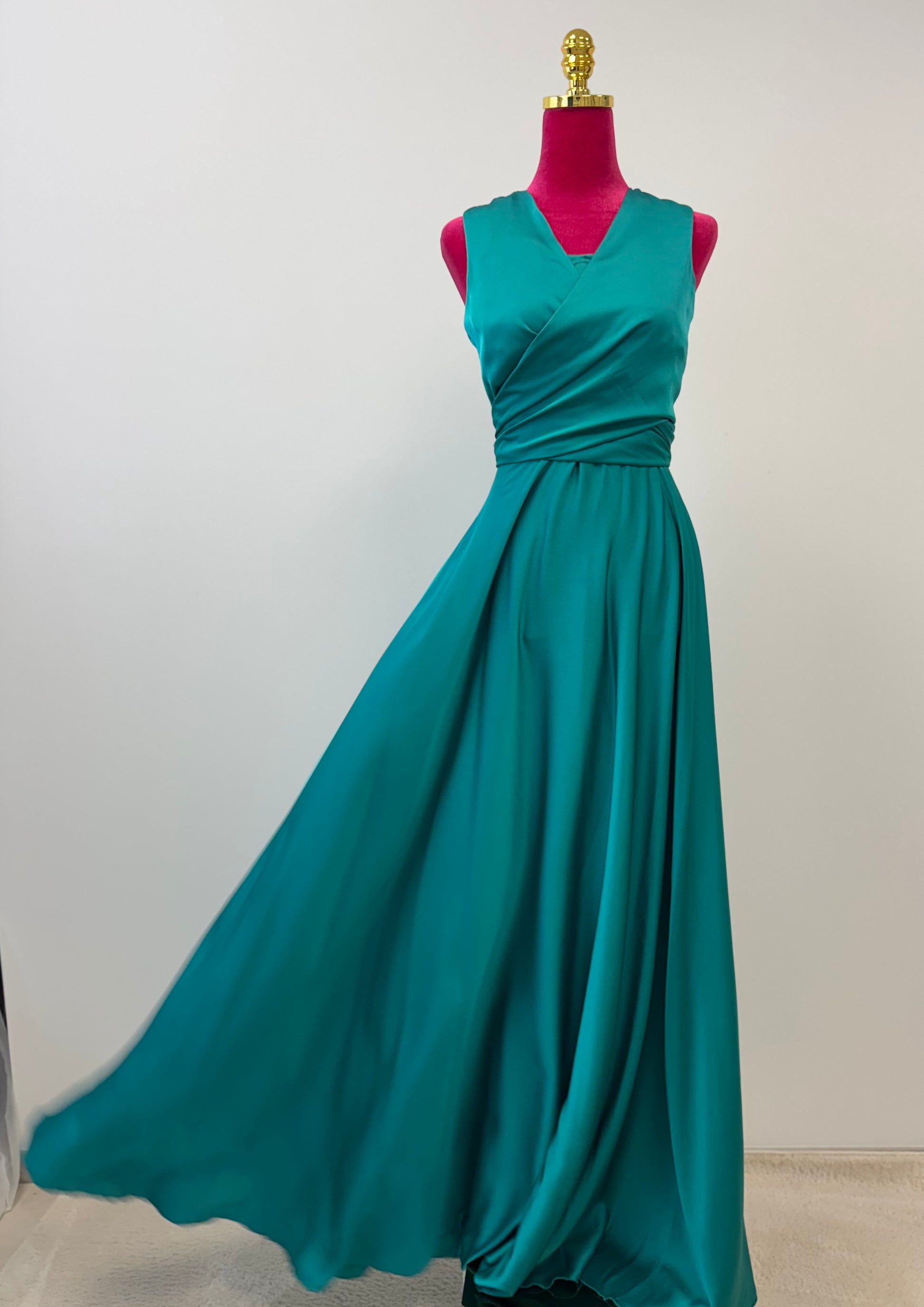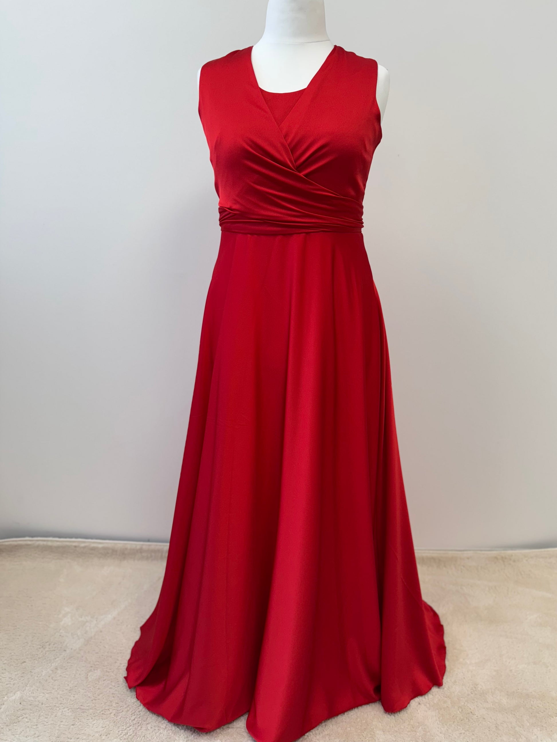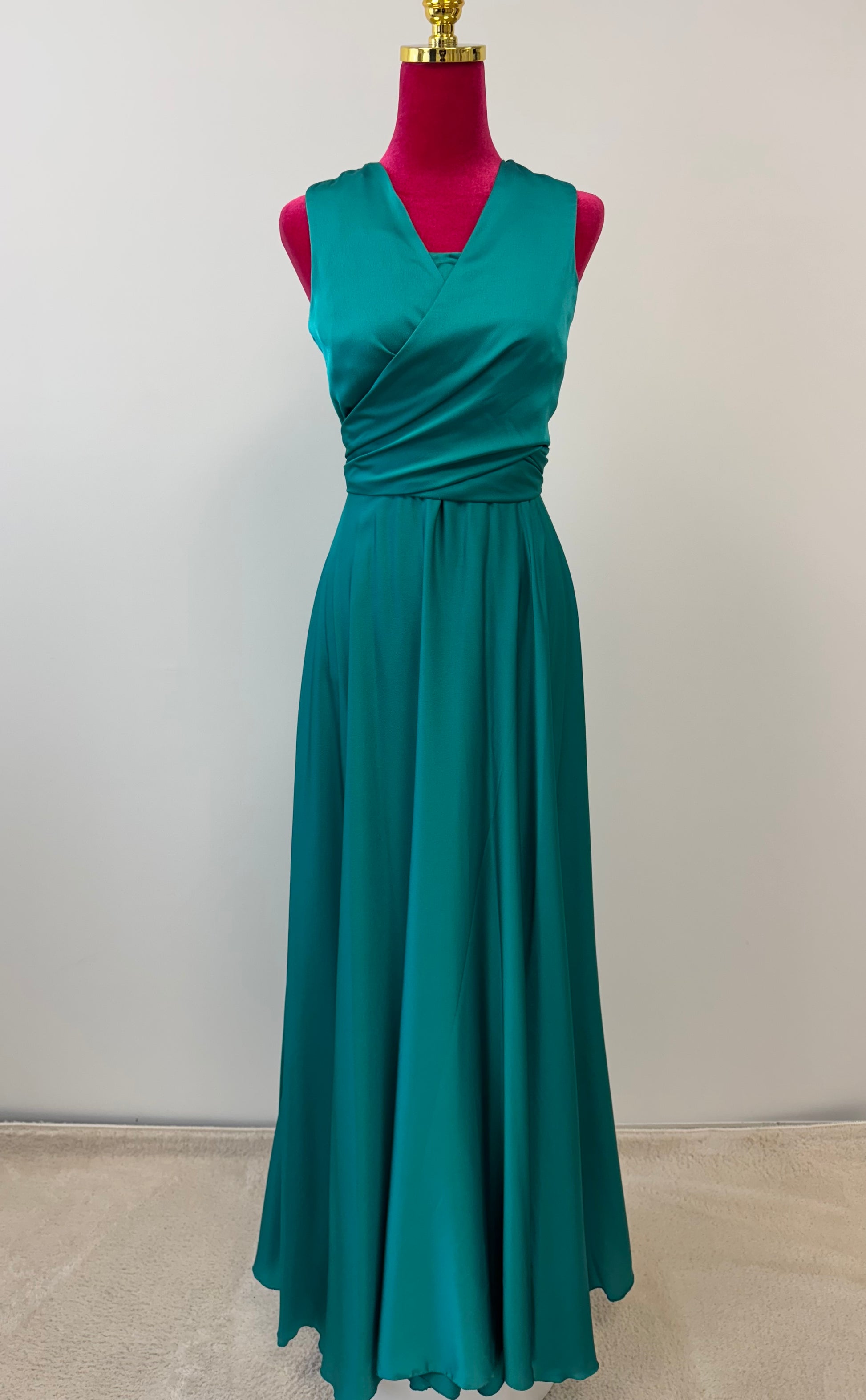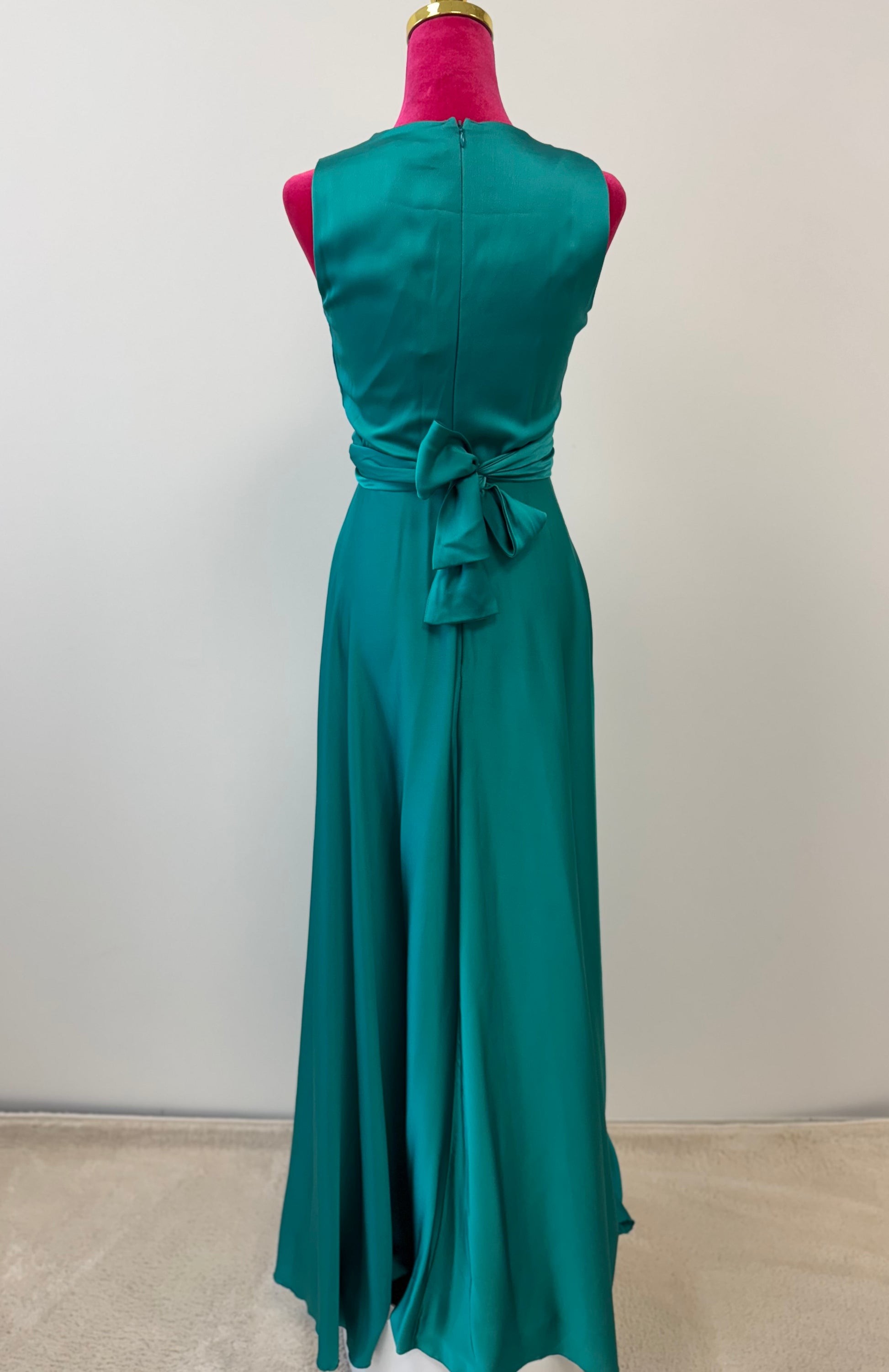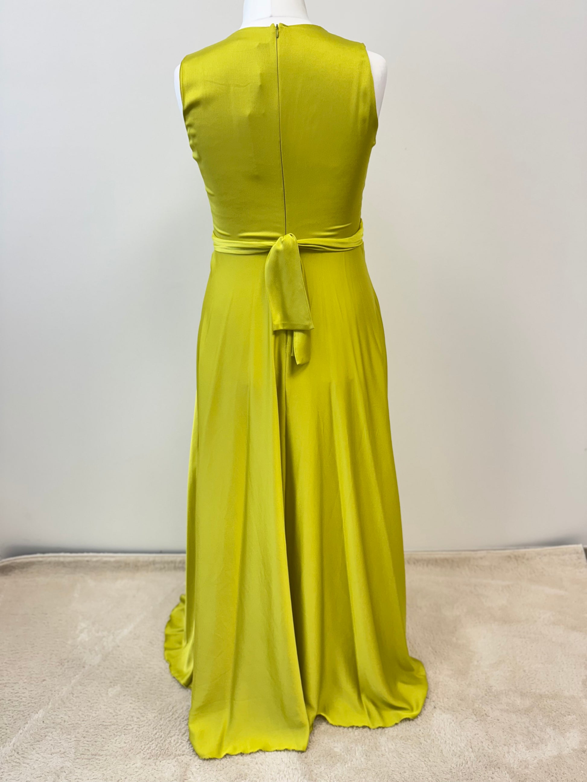 Der Rücken ist mit einem Reißverschluss gearbeitet und einer feinen Taillenbindung verziert, die dem Kleid einen zarten, femininen Akzent gibt. Perfekt für Hochzeiten, Abibälle und alle besonderen Anlässe, bei denen ein stilvoller, leichter Look gefragt ist.