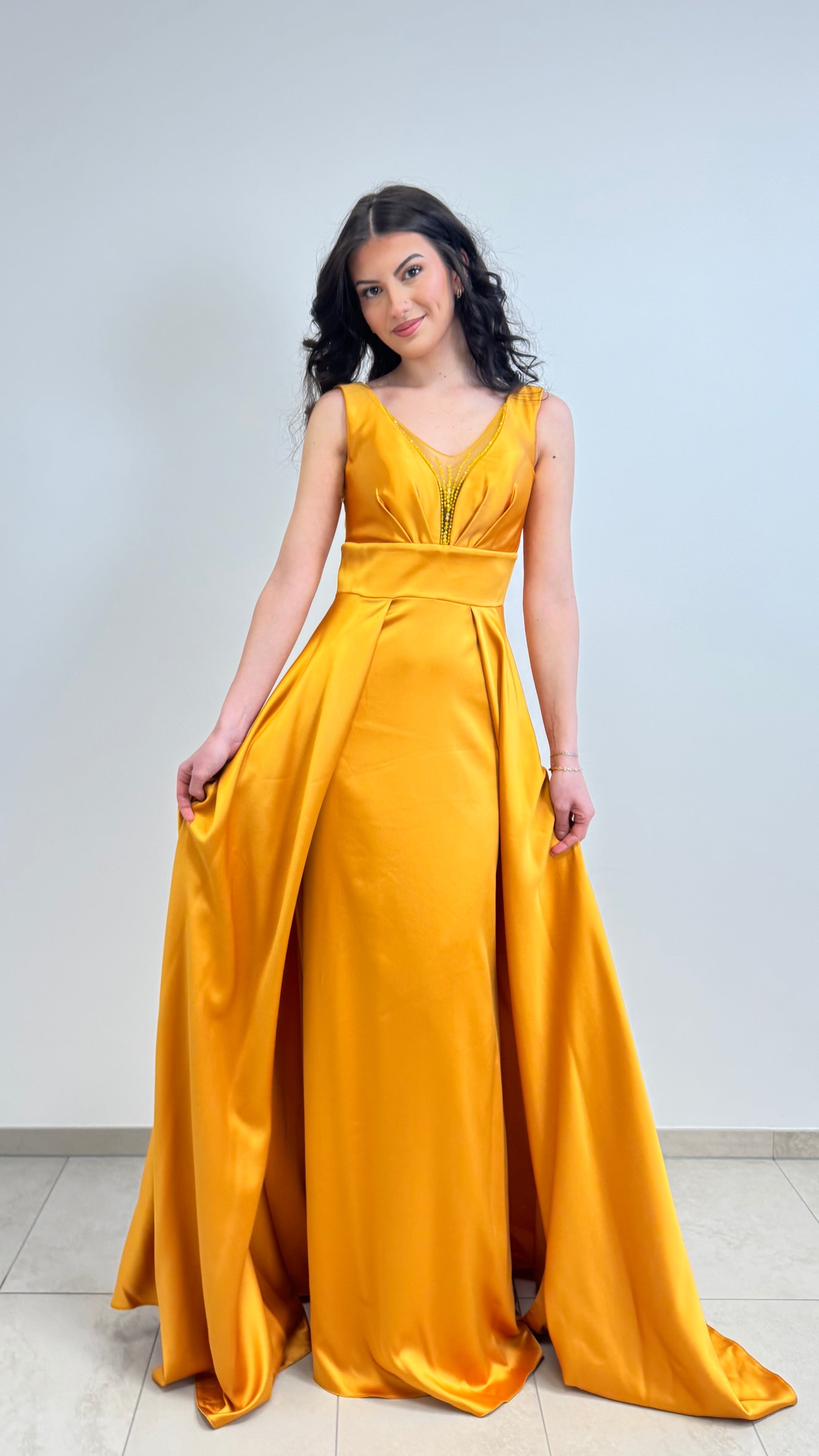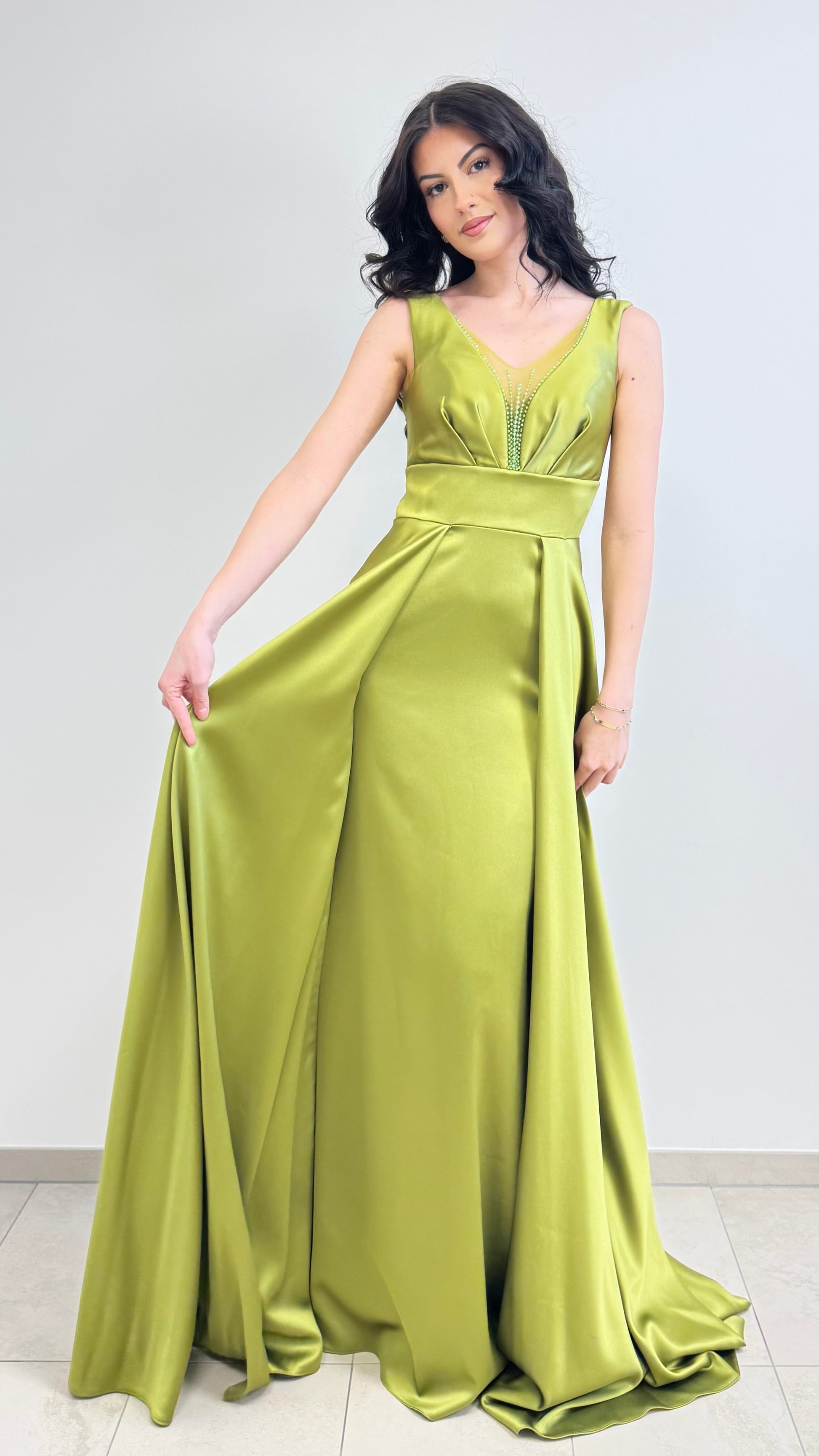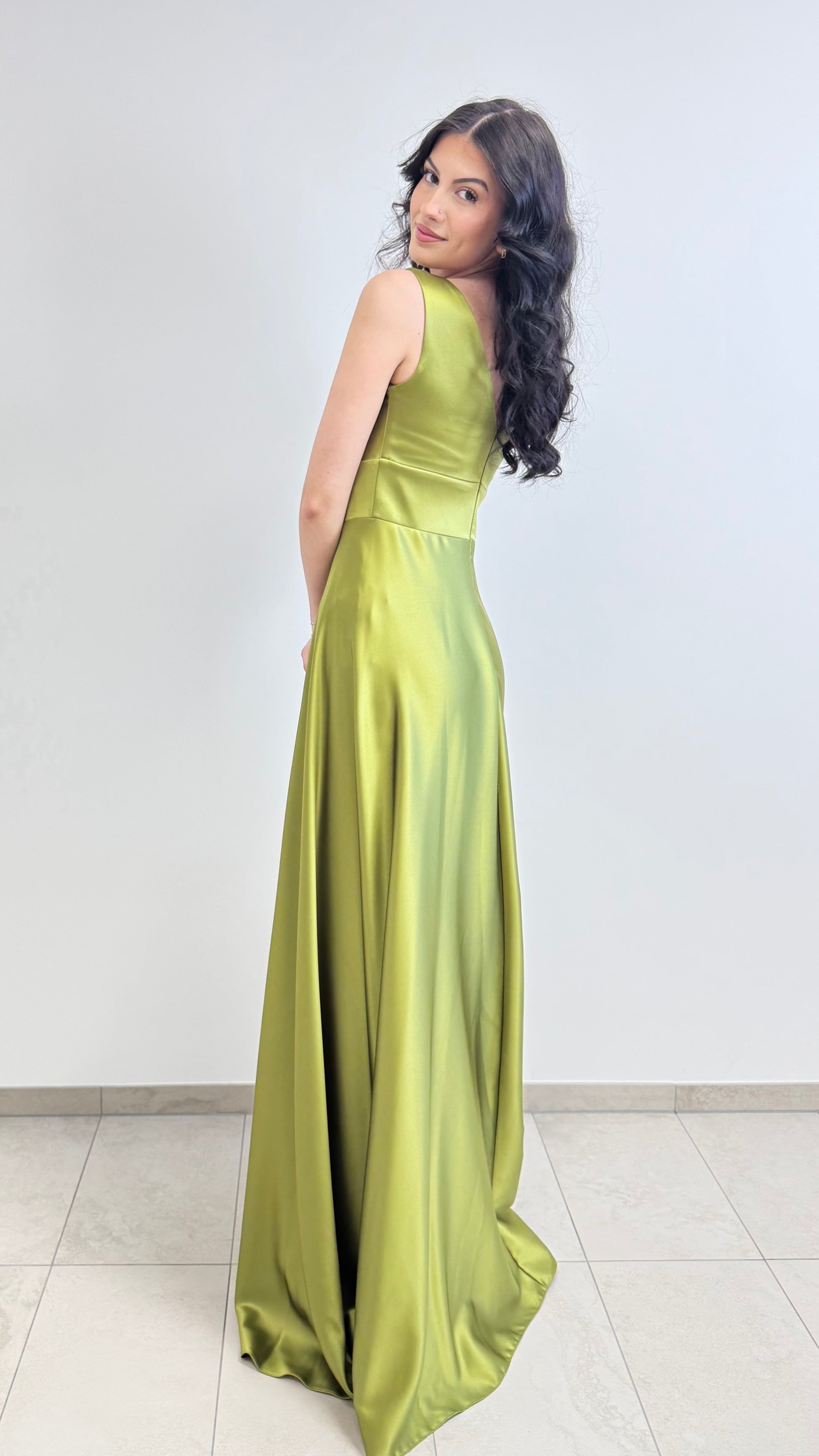 Stilvolles Satin-Kleid mit edler Strassverzierung am Ausschnitt. Ärmeloses Design, figurbetonte Taille und ein doppellagiger Rock in eleganter Bodenlänge.