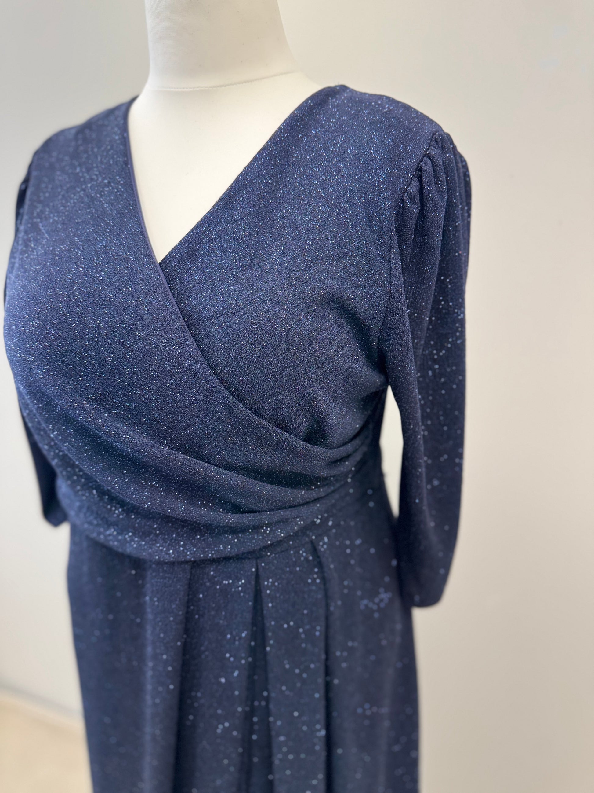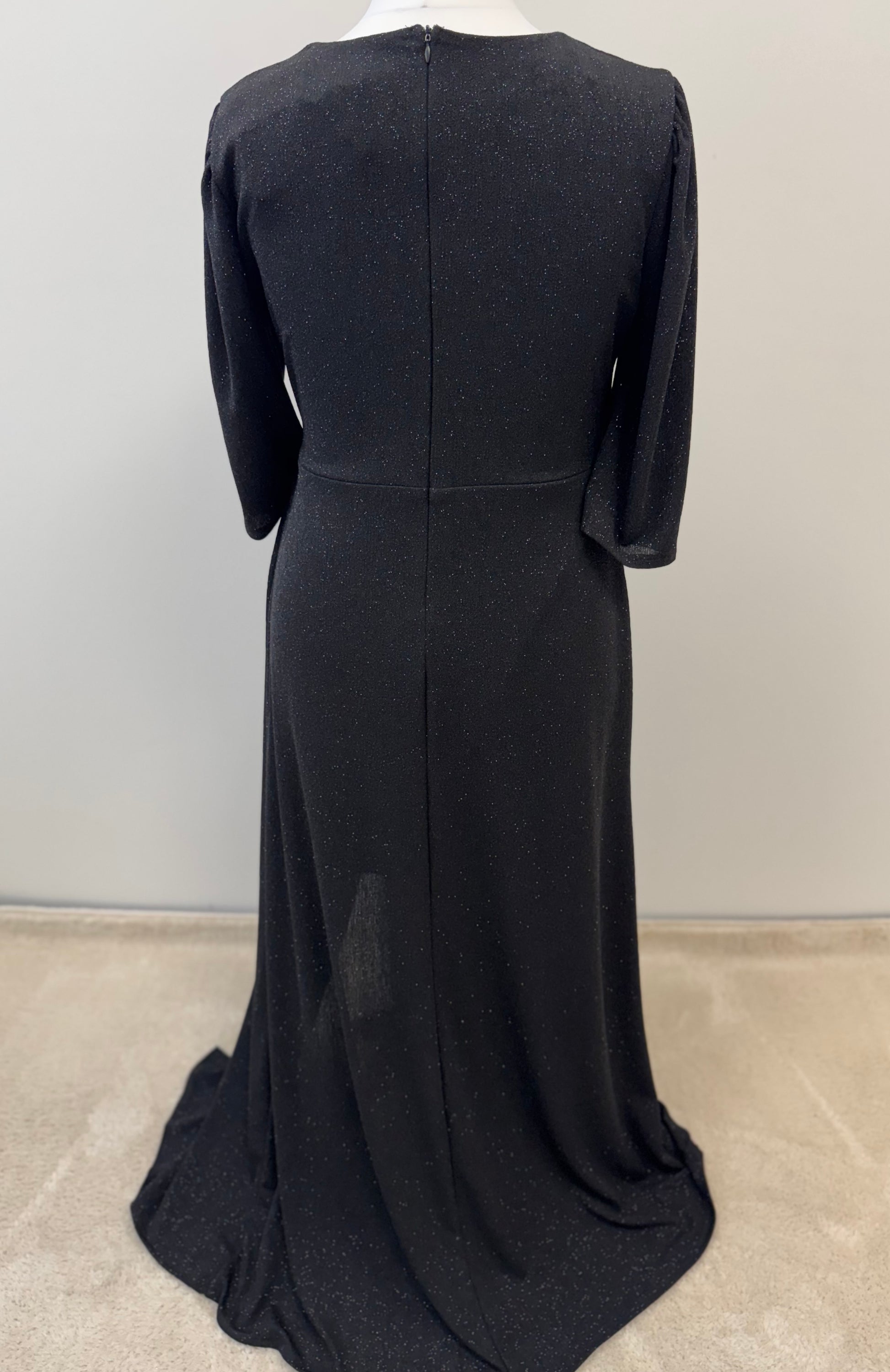 Dieses edle Maxikleid beeindruckt durch seinen schimmernden Stoff und den femininen Schnitt. Die elegante Wickeloptik betont das Dekolleté, während der fließende Rock mit dezentem Schlitz für eine stilvolle Silhouette sorgt. Die gepolsterte Brustpartie bietet angenehmen Halt und formt ein schönes Gesamtbild. Die Ärmel sind leicht gerafft und fallen locker bis zum Handgelenk. Geschlossen wird das Kleid mit einem Reißverschluss in der hinteren Mitte – ideal für festliche Anlässe und elegante Abendveranstaltungen.