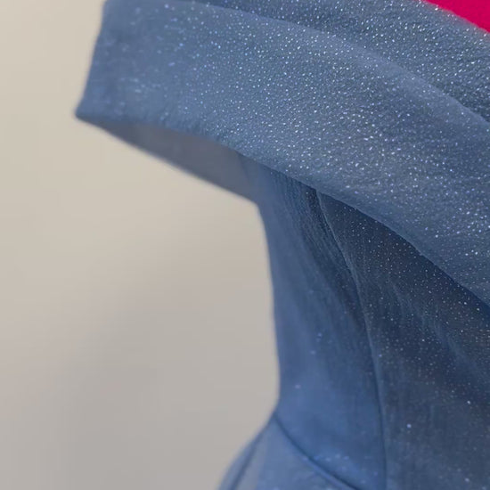 Dieses elegante Abendkleid verzaubert mit seinem schulterfreien Design und dem zarten, funkelnden Stoff, der dem gesamten Modell eine edle Ausstrahlung verleiht. Das Oberteil ist mit einer eleganten, überkreuzten Drapierung gearbeitet, die das Dekolleté wunderschön betont. Die feinen Träger sorgen für zusätzlichen Halt, ohne den Off-Shoulder-Look zu stören.
