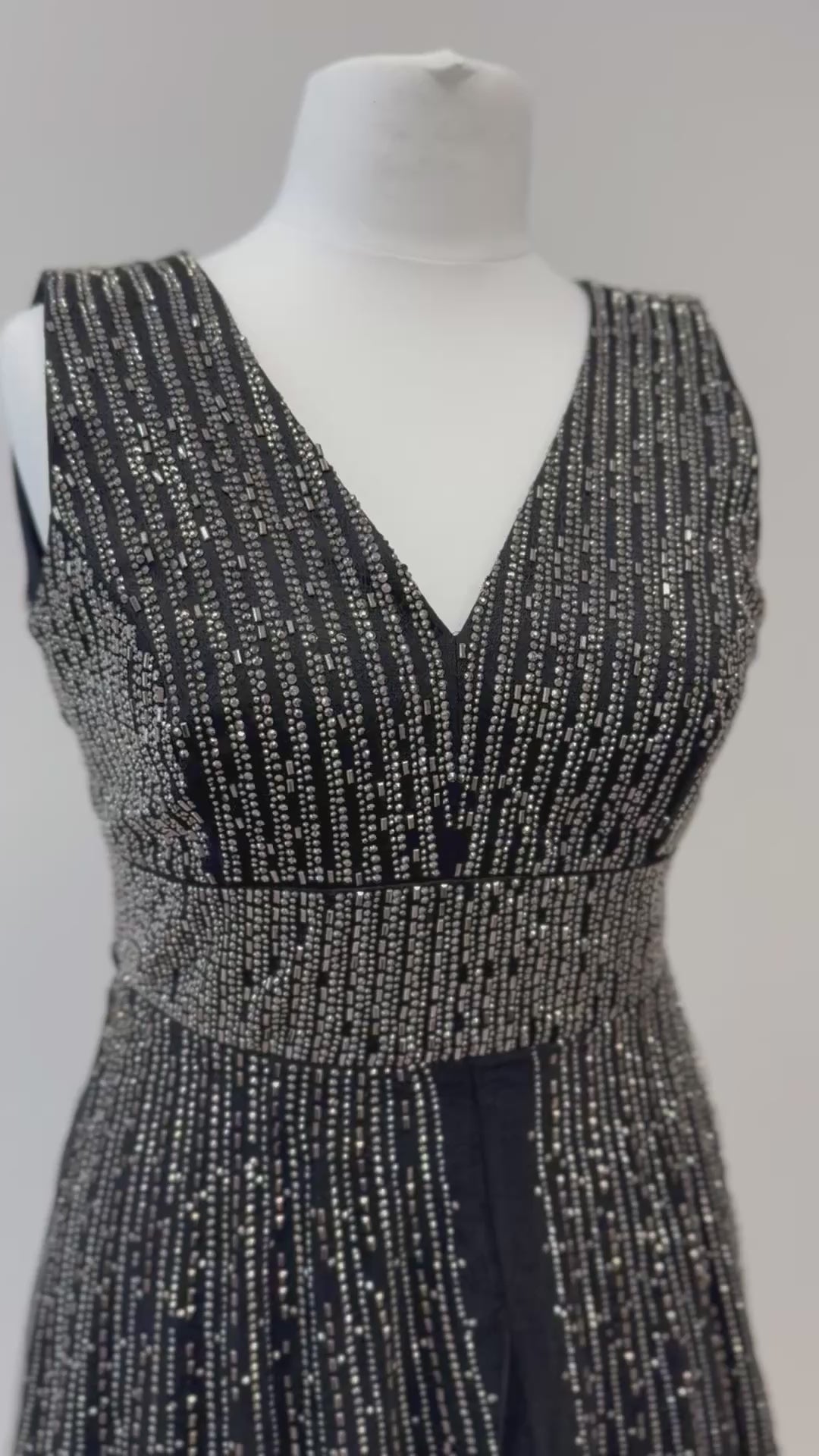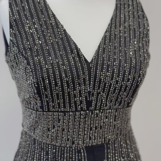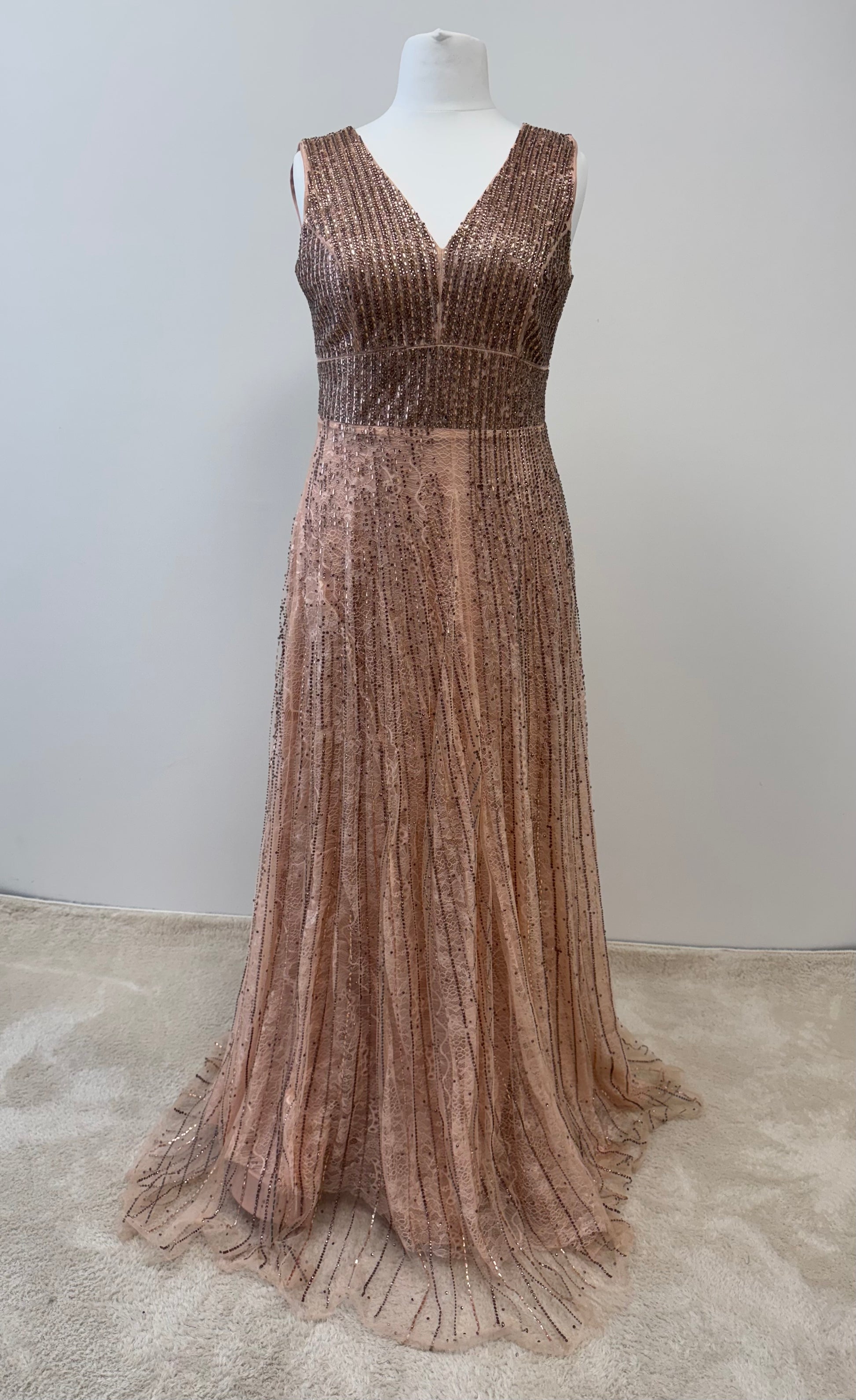 Ein zeitlos schönes Abendkleid für festliche Anlässe! Dieses Modell überzeugt durch seine feine, gleichmäßig gearbeitete Perlenstruktur, die in vertikalen Linien über das gesamte Kleid verläuft und ihm einen eleganten Schimmer verleiht. Der V-Ausschnitt vorne und das tiefe Rückendekolleté unterstreichen die feminine Silhouette.