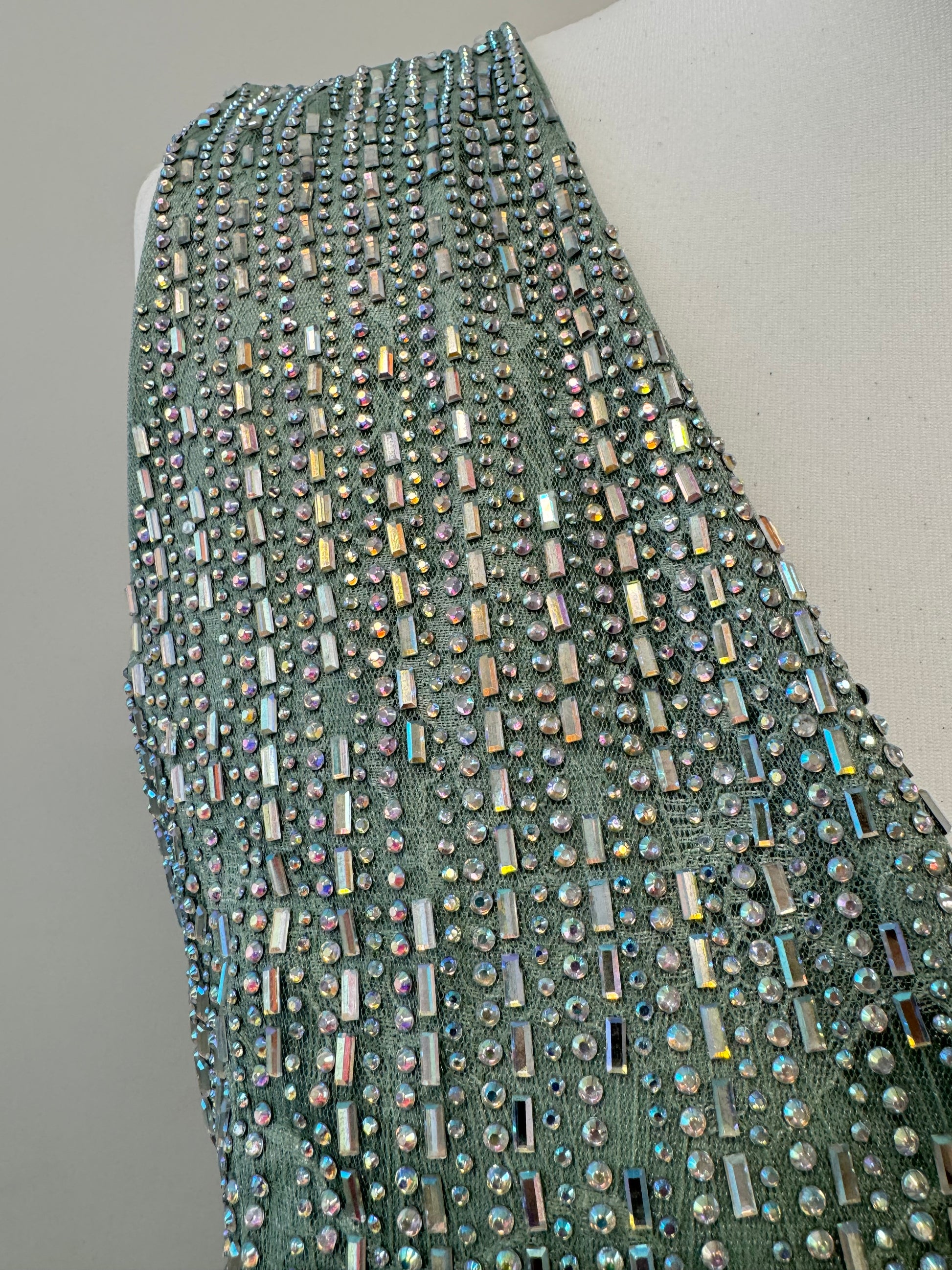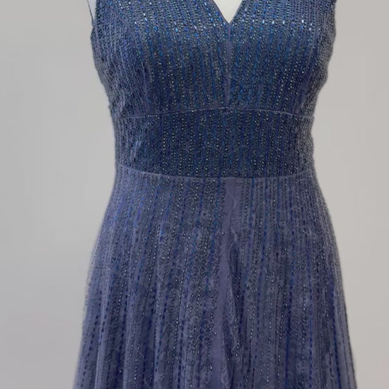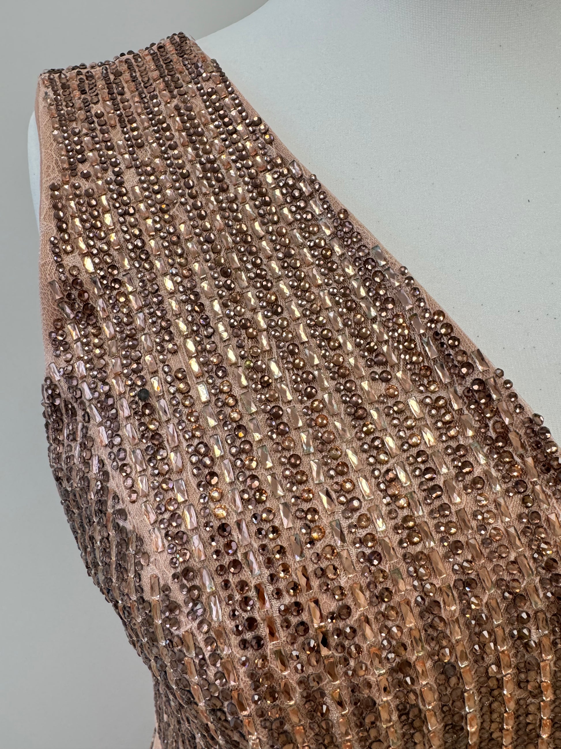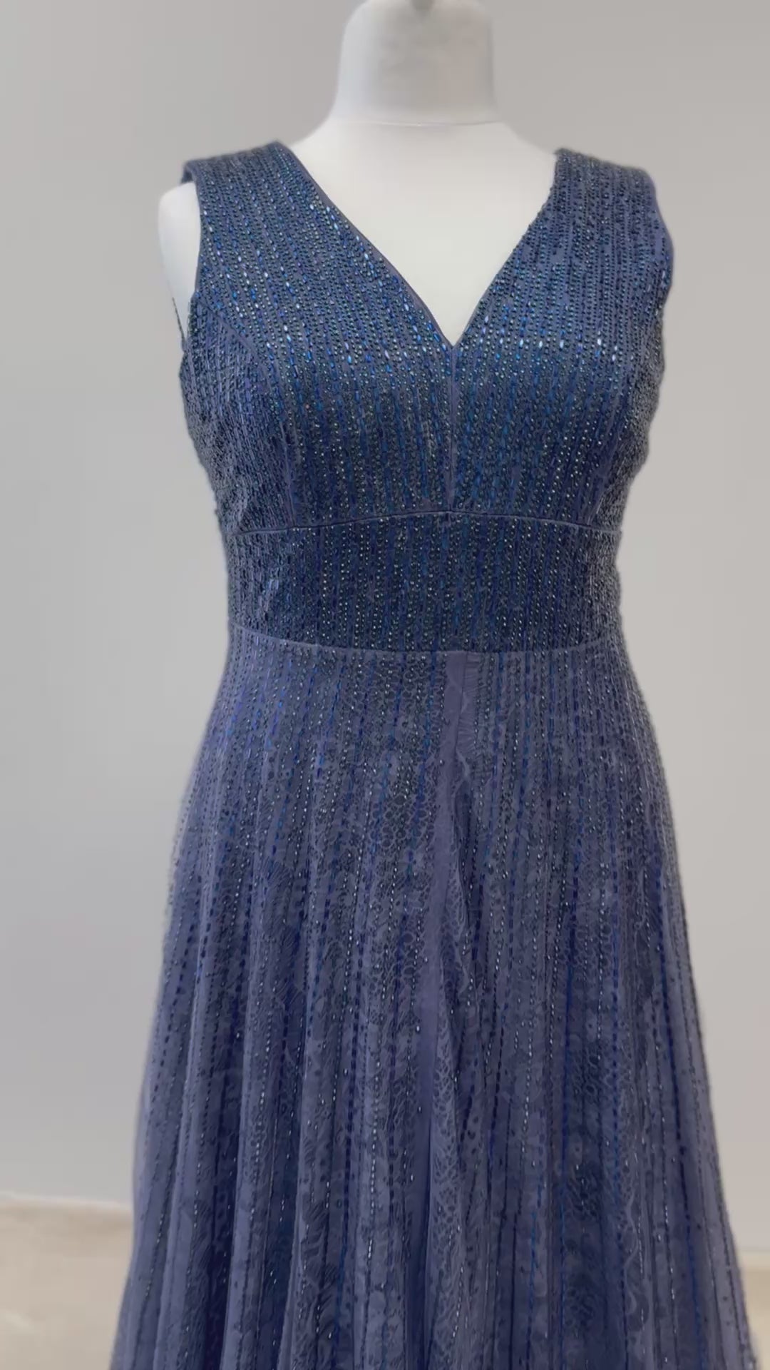 Ein zeitlos schönes Abendkleid für festliche Anlässe! Dieses Modell überzeugt durch seine feine, gleichmäßig gearbeitete Perlenstruktur, die in vertikalen Linien über das gesamte Kleid verläuft und ihm einen eleganten Schimmer verleiht. Der V-Ausschnitt vorne und das tiefe Rückendekolleté unterstreichen die feminine Silhouette.
