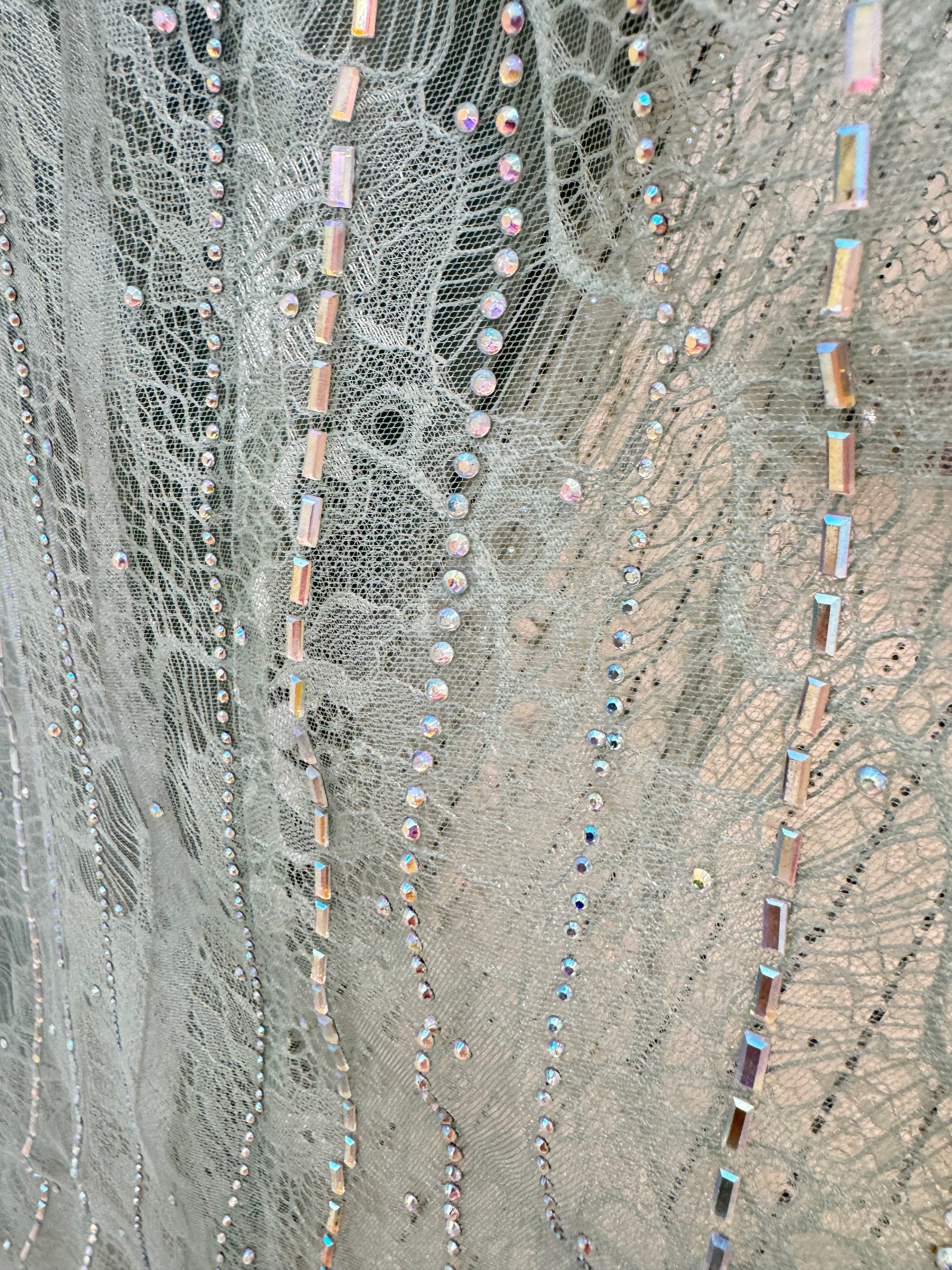 Der Rockteil besteht aus drei Lagen, wobei die mittlere Lage aus feiner Spitze gefertigt ist – dies verleiht dem Kleid zusätzliche Tiefe und eine besonders edle Optik. Der fließende Fall sorgt für eine elegante Bewegung bei jedem Schritt.